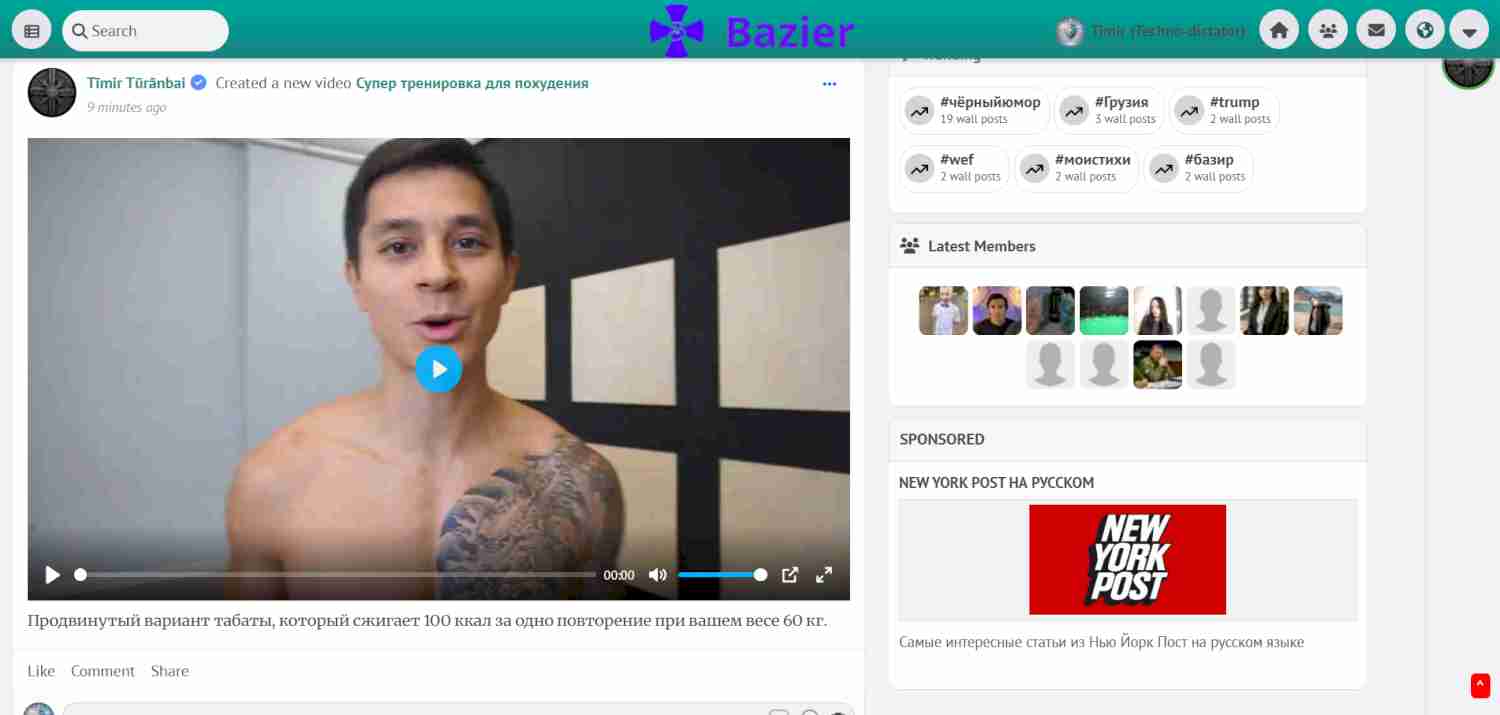 Hooray! Now you can upload videos to Bazir. To do this, click on video in the top panel when creating a post. Next, add a title and description of the video, select a file and upload. You can watch the video in a small window while scrolling through the feed.