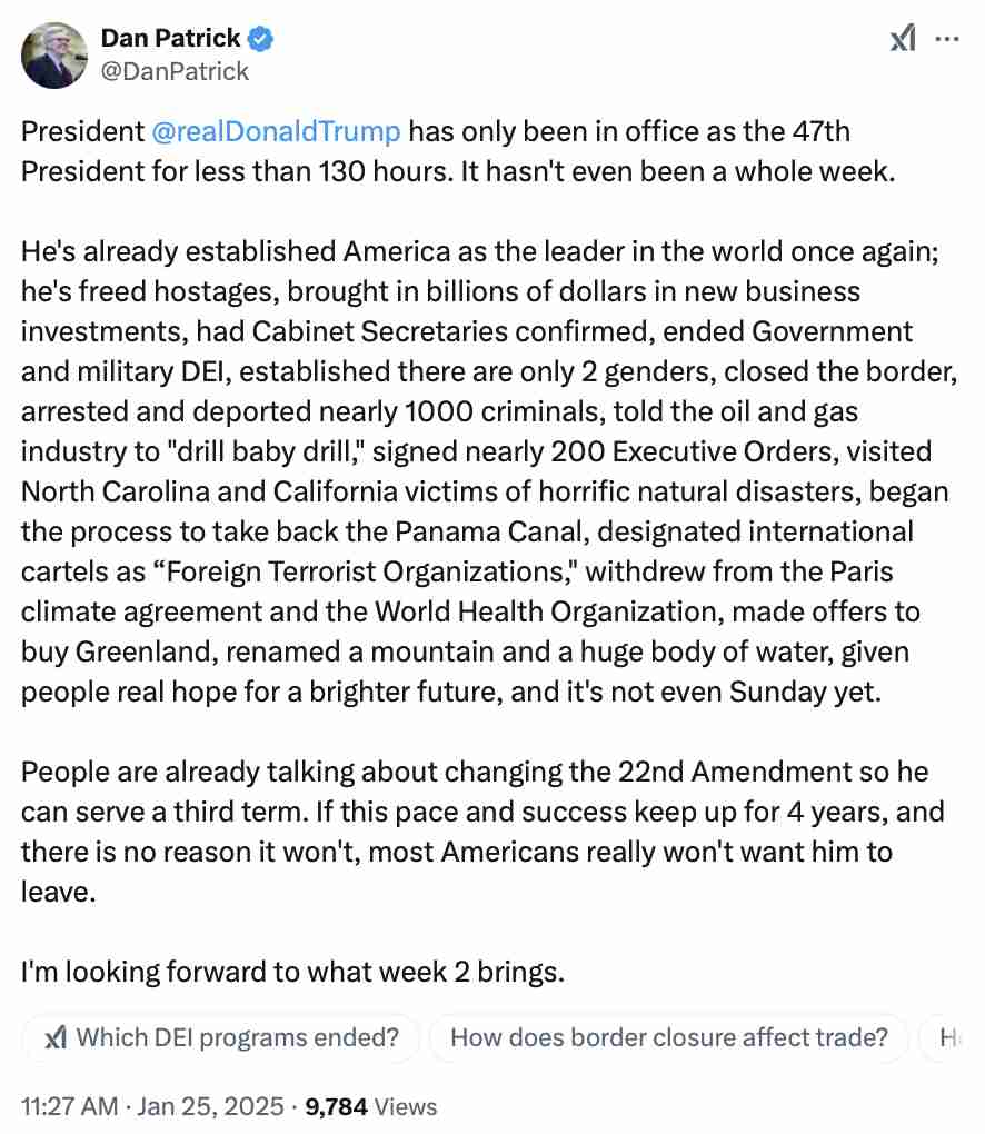 Он уже вновь утвердил Америку как мирового лидера: освободил заложников, привлек миллиарды долларов новых бизнес-инвестиций, подтвердил назначения членов Кабинета, ликвидировал правительственные и военные DEI-программы, установил, что существует только два пола, закрыл границу, арестовал и депортировал почти 1000 преступников, сказал нефтегазовой отрасли «добывайте, добывайте, добывайте», подписал почти 200 указов, посетил пострадавших от природных катастроф в Северной Каролине и Калифорнии, начал процесс возвращения Панамского канала, объявил международные картели «иностранными террористическими организациями», вышел из Парижского климатического соглашения и Всемирной организации здравоохранения, предложил купить Гренландию, переименовал гору и огромный водоем, вселил в людей надежду на светлое будущее — и это еще даже не воскресенье.
