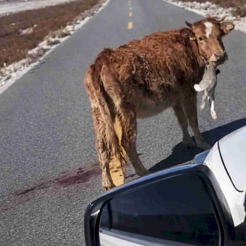 На одной из трасс Казахстана корова преспокойно жуёт... зайца. Считается, что коровы могут поедать плоть, когда им не хватает каких-либо минералов.